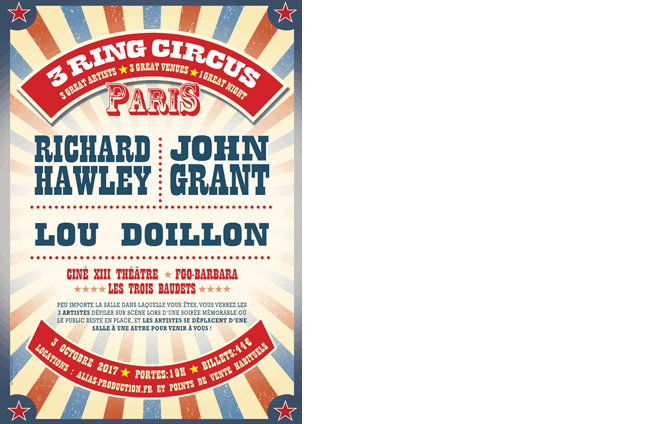 Lundi 3 Octobre, Lou Doillon avec Richard Hawley et John Grant pour trois concerts exceptionnels dans trois salles différentes : Ciné XIII Théâtre, le Fgo-Barbare et Les trois Baudets.