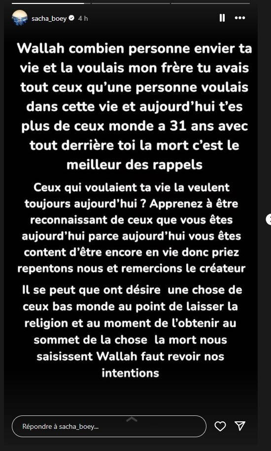 Originaire également de Montreuil, Sacha Boey a tenu à rendre hommage à son ami sur les réseaux sociaux. "Combien de personnes enviaient ta vie et la voulaient, mon frère… Tu avais tout ce qu’une personne pouvait désirer dans cette vie. Et aujourd’hui, tu n’es plus de ce monde à 31 ans, avec tout derrière toi. La mort, c’est le meilleur des rappels", a notamment écrit le joueur du Bayern Munich sur Instagram.