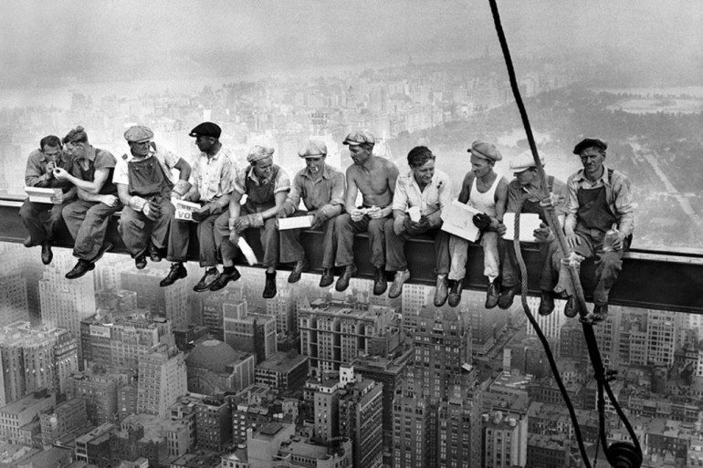 L'autre référence est naturellement le Déjeuner en haut d'un gratte-ciel (Lunch Atop a Skyscraper), une photographie parmi les plus célèbres du monde où l'on voit onze ouvriers prenant une collation sur une poutre suspendue dans le ciel de New-York.