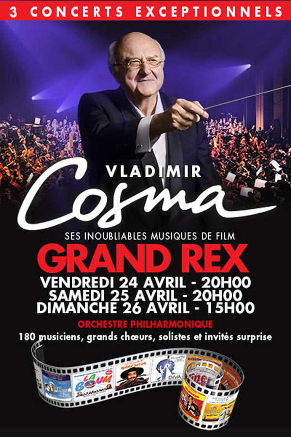 Vladimir Cosma rejouera tous ses grands morceaux en avril prochain, à l'occasion de son 80e anniversaire. Trois dates exceptionnelles sur la scène du Grand Rex, où il dirigera un orchestre symphonique, 180 musiciens et chanteurs, des solistes de renom, des invités surprises (le groupe Brigitte, Tom Novembre, Kids United)…Au programme : les musiques les plus emblématiques (La Boum, Diva, Le Grand Blond, Rabbi Jacob…) et d'autres œuvres célèbres et inédites dans de nouvelles versions de concert.