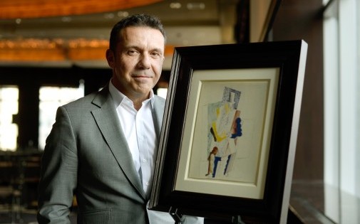 Olivier Picasso, le petit-fils de Pablo Picasso, pose avec L'Homme au Gibus avant la loterie mondiale organisée par Sotheby's à Paris le 3 décembre 2013.