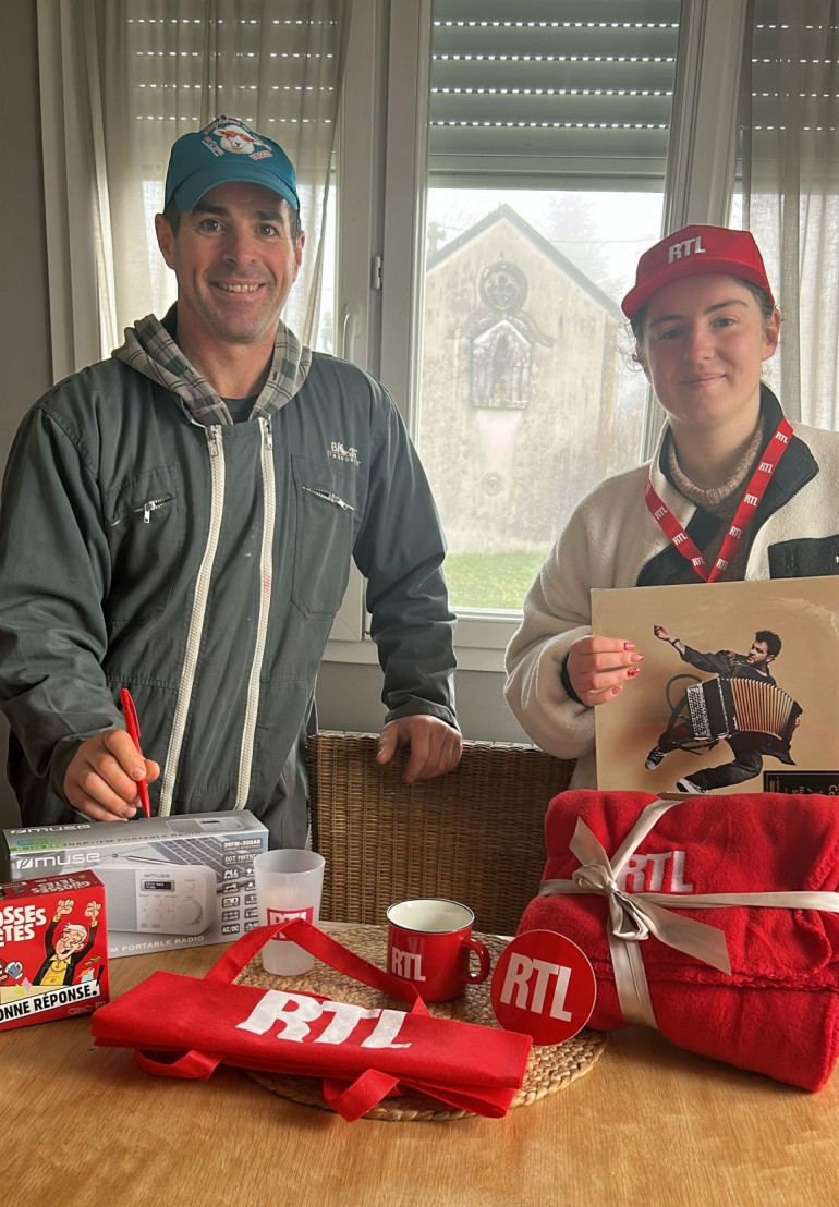Stéphane Boulas, agriculteur à Domptail (Vosges) et Marie, gagnante de la valise RTL, le 25 février 2026.