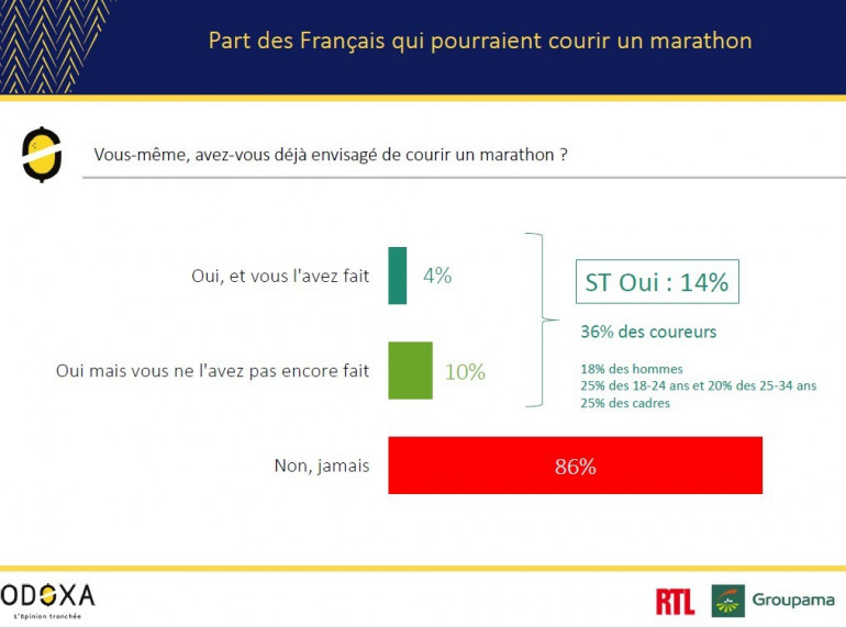L’idée séduit particulièrement les jeunes (25%), les cadres (25%) et les hommes (18%). Chez les pratiquants de course à pied, ils sont 36% à envisager courir un marathon.