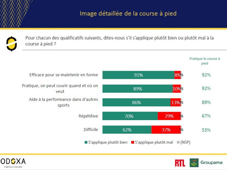 S’ils sont si nombreux à courir, c’est que les Français y perçoivent de nombreux avantages. Avant tout efficace pour se maintenir en forme (91%), la course à pied est aussi pratique : on peut courir où et quand on veut (89%).