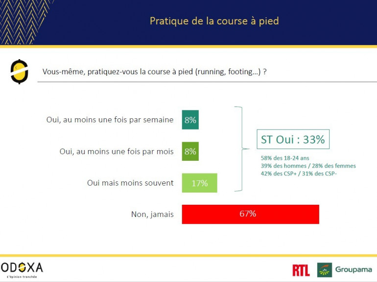 Qu’ils courent le dimanche matin pour se maintenir en forme ou qu’ils préparent un marathon, les Français sont nombreux à pratiquer la course à pied. Ils sont aujourd’hui 33%, dont 8% au moins une fois par semaine. La course à pied séduit particulièrement les hommes (39%) et les CSP+ (42%).
