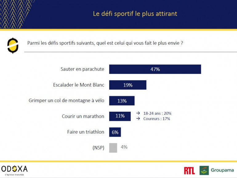 Un Français sur trois pratique la course à pied (8% au moins une fois par semaine) bien que cette activité sportive soit largement perçu comme répétitive et difficile. 14% des personnes interrogées ont déjà envisagé de courir un marathon (4% l’ont déjà fait). Le saut en parachute est le défi sportif qui fait le plus envie devant l'escalade du Mont-Blanc.