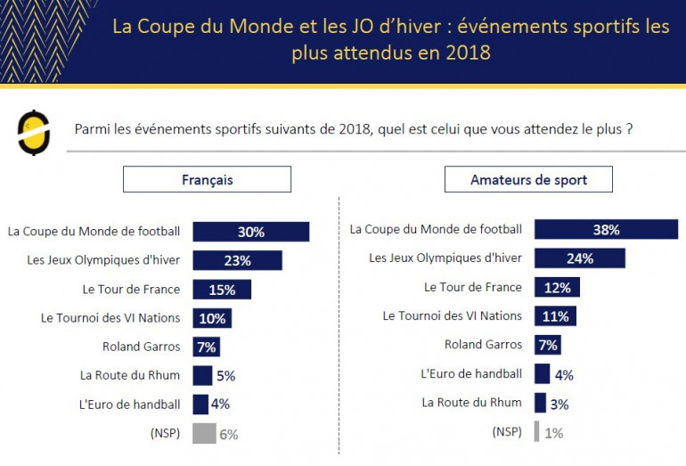 Le Mondial de foot en Russie (14 juin-15 juillet) arrive en tête du classement. Evénement le plus attendu de l’année par 30% des Français et 38% des amateurs de sport, la compétition la plus suivie au monde devance les Jeux olympiques d’hiver (23 et 24%) de Pyeongchang (Corée du Sud), qui se dérouleront essentiellement la nuit heure française.