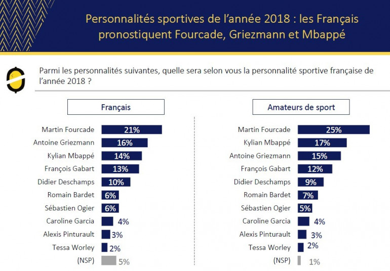 Du côté des amateurs de sport, le classement est quasiment identique si ce n’est Kylian Mbappé (17%) devant Antoine Griezmann (15%) pour compléter le podium là encore dominé par Martin Fourcade (25%).