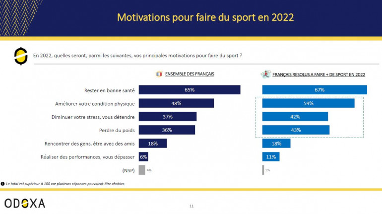 résolution de faire plus de sport ou davantage d’activité physique en 2022. Une proportion importante qui est plus élevée parmi les femmes (45%) et surtout chez les moins de 35 ans, qui sont 60% à avoir pris cette résolution pour l’année à venir, ainsi que chez les salariés (49%) dont les modes de vie ont été fortement bouleversés par la pandémie.