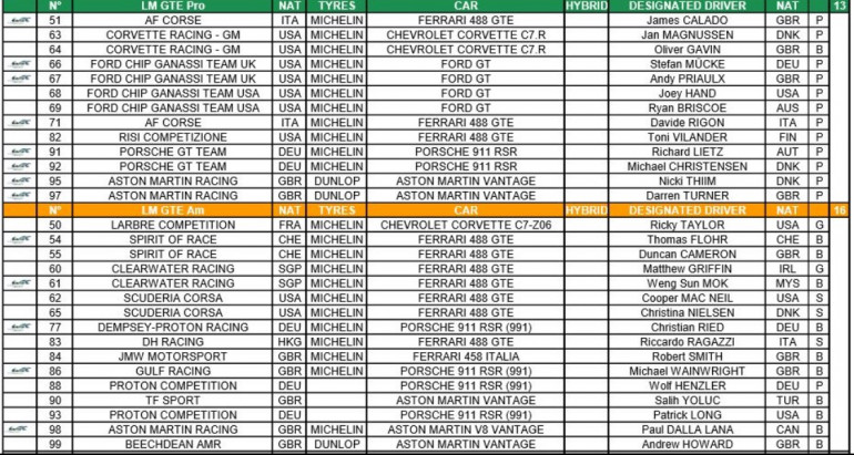 Enfin, 29 bolides GT sont engagés en catégorie pro et amateur, avec la présence évidemment des Porsche, Ford GT, Aston Martin et Ferrari. Notons que sur les 180 pilotes au départ, une seule femme est engagée à ce jour, la Danoise Christina Nielsen sur Ferrari. Le départ de la 85e édition des 24 Heures du Mans sera donné le samedi 17 juin prochain. Le nom de celui qui succédera à l'acteur Brad Pitt, qui l'an passé avait lancé la course, n'a pas été dévoilé.