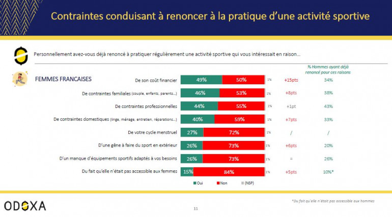 Les femmes sont également plus nombreuses à avoir déjà renoncé à une activité sportive en raisons de contraintes familiales (46% contre 38%) ou domestiques (40% contre 33% des hommes) alors que de nombreuses études indiquent que la charge en la matière pèse encore de façon plus forte sur les femmes.