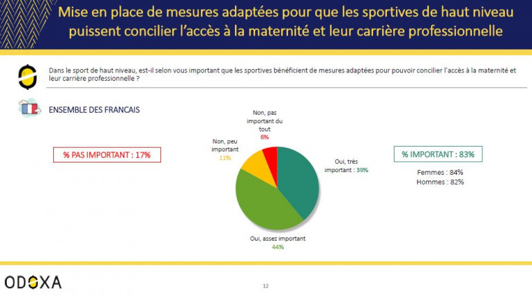 Les femmes rencontrent par ailleurs plus de difficultés pour accéder à la pratique sportive : 49% y ont déjà renoncé pour des raisons financières (contre 34% des hommes), 46% pour des contraintes familiales (vs 38%) et 40% pour des contraintes domestiques (vs. 33%). Enfin, pour 83% des Français, il est important que les sportives de haut niveau bénéficient de mesures adaptées pour pouvoir concilier la maternité et leur carrière professionnelle.