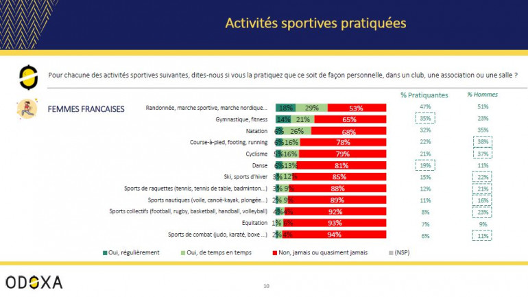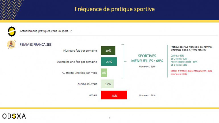 Il est également important de souligner que l’accès au sport des femmes n’est pas uniforme et reste confronté à des différences de profils. 48% des femmes pratiquent mensuellement une activité sportive mais le taux d’activité physique varie de 69% chez les cadres, 59% chez les membres des foyers les plus aisés, 60% chez les 18-24 ans et 55% chez les 25-34 ans, à 42% chez les mères ayant des enfants présents au foyer et 30% chez les ouvrières.