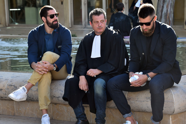 Nikola et Luka Karabatic avec leur avocat à Montpellier, le 25 juin 2015