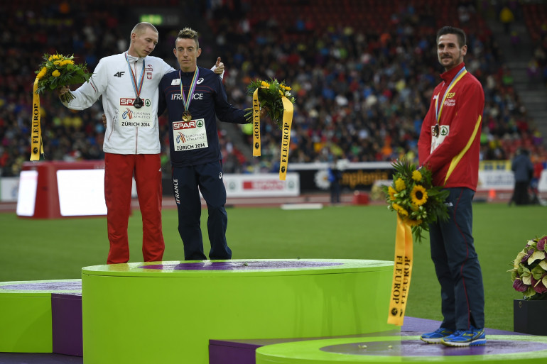 Yoann Kowal sur la plus haute marche du podium lors des championnats d'Europe d'athlétisme 2014 de Zurich