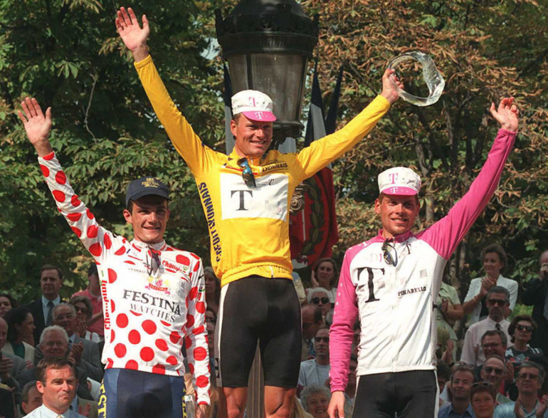 Bjarne Riss entouré de Richard Virenque et Jan Ullrich en juillet 1996
