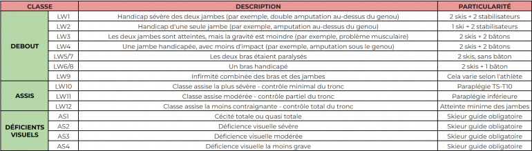 Concrètement, on peut participer debout si on possède un handicap d’un ou de plusieurs membres (classes LW1 à LW9), assis avec un handicap des membres inférieurs et éventuellement du tronc (classes LW10 à LW12) ou chez les déficients visuels pour les non-voyants ou malvoyants, qui ont recours à un guide devant eux chargé de leur indiquer verbalement les directions (classes AS1 à AS4 en alpin, NS1 à NS3 en nordique).