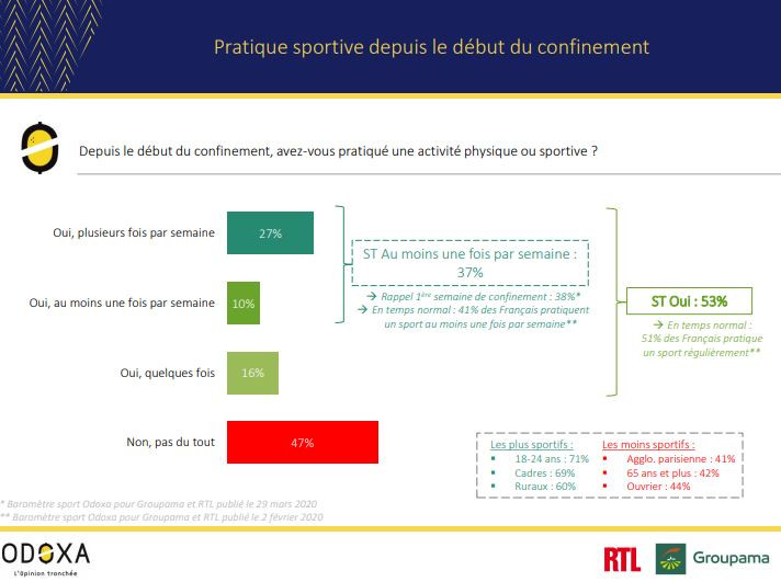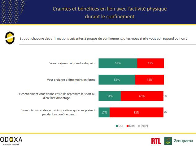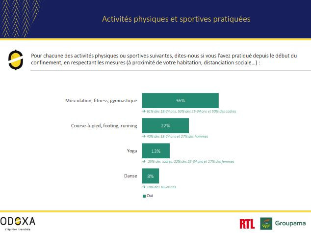 53% des Français ont fait du sport depuis le début du confinement (+2 points par rapport à la dernière enquête), dont 37% de manière hebdomadaire. 59% des sondés craignent de perdre du poids durant cette période et 56% d'être moins en forme. Musculation, fitness et gymnastique sont les activités les plus pratiquées, notamment grâce à des exrcices disponibles en vidéo.