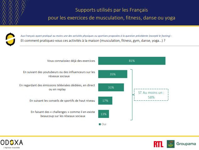 Les Français ayant pratiqué l’une de ces activités d’intérieur connaissaient déjà des exercices (81%). Mais ils se tournent aussi vers des supports avec des cours en vidéo. 58% d’entre eux utilisent ces supports visuels pour pratiquer une activité physique d’intérieur.