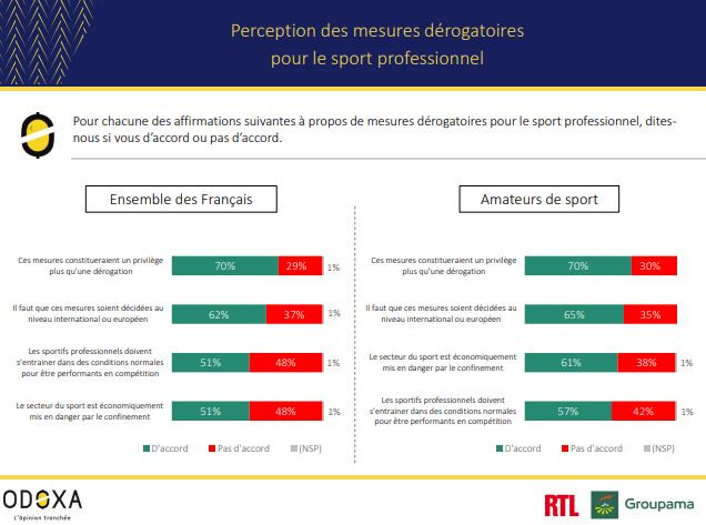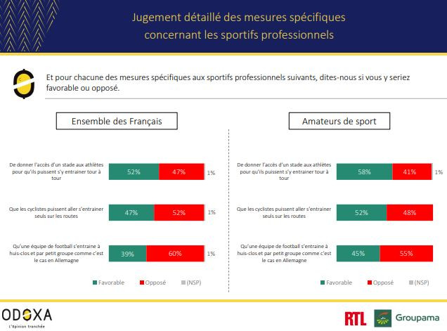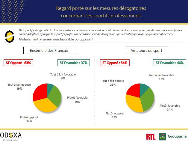 La question que tout le monde se pose est donc de savoir comment aménager le calendrier tout en laissant la possibilité aux sportifs de bien se préparer et donc, de les déconfiner en amont par des mesures dérogatoires. Si de telles mesures venaient à être annoncées, les Français les accueilleraient mal. 63% d’entre eux s’y opposent. Les amateurs de sport y sont eux aussi majoritairement opposés (54%).