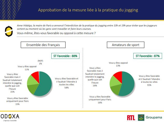 Par ailleurs, 88% des sondés sont d'accord avec la décision prise par la mairie de Paris à l'encontre des amateurs de jogging : l'interdiction de sortir courir entre 10h et 19h. 58% souhaitent voir cette restriction étendue à toutes les villes du pays. Voici les principaux enseignements de la dernière enquête réalisée par Odoxa pour RTL et Groupama.