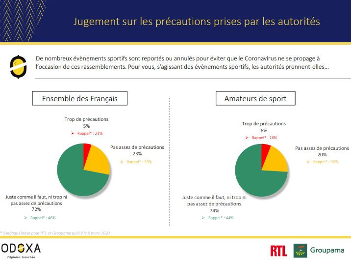 Il n’y a plus que 5% des Français qui jugent qu’on prend trop de précautions. Notons que 23% de nos concitoyens considèrent que l’on peut aller encore plus loin et qu’il n’y a pas assez de précautions prises. Les amateurs de sport sont parfaitement en ligne avec le reste de la population.