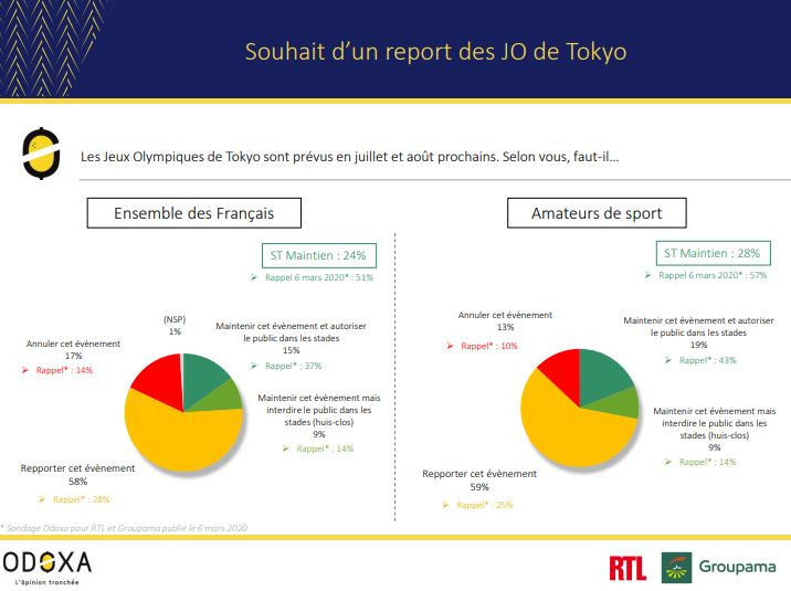 Si début mars un Français sur deux (51%) souhaitait que les JO soient maintenus, leur opinion a beaucoup évolué depuis. Ils ne sont plus que 24% à le penser. La majorité de nos concitoyens affirme désormais qu’il faut reporter les Jeux (58%) voire même supprimer l’événement (17%). Les amateurs de sport sont d’accord avec les Français même si, on l’imagine, ils devaient attendre ce rendez-vous avec impatience.