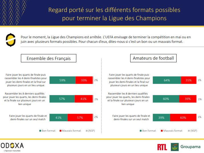 Ils sont en revanche plus réservés sur une autre piste étudiée par l’UEFA : celle de faire jouer les quarts et demi-finales sur un seul match. 57% des Français et 60% des amateurs de football affirment que ce serait un mauvais format.