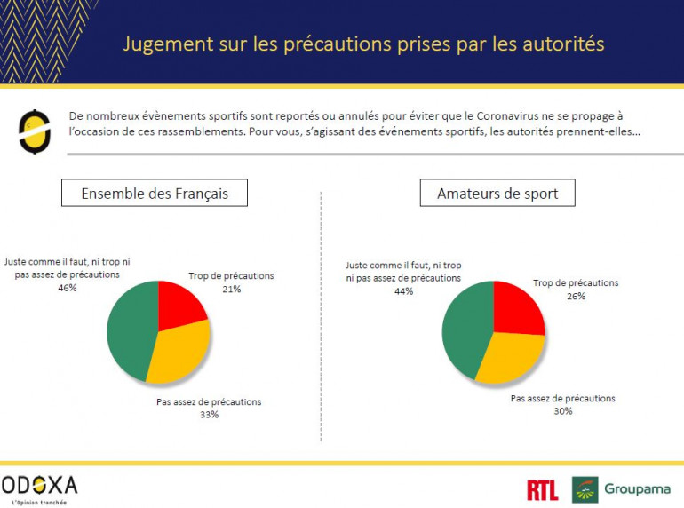 Les Français (46%) et les amateurs de sport (44%) considèrent en premier lieu que ces précautions sont bien adaptées. Mais la majorité d’entre eux ne se satisfait pas des mesures prises, soit en considérant que l’on prend trop de précautions (21% et 26%) ou bien qu’au contraire, on ne prend pas assez de précautions (33% et 30%).