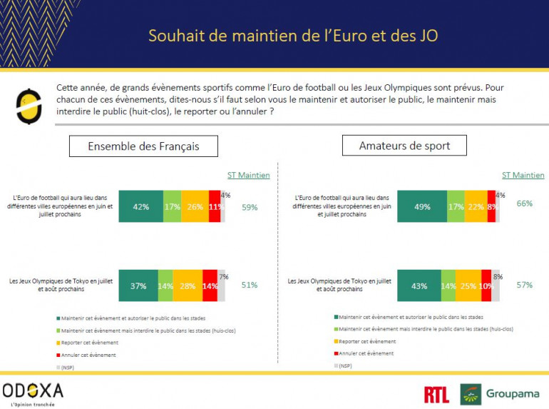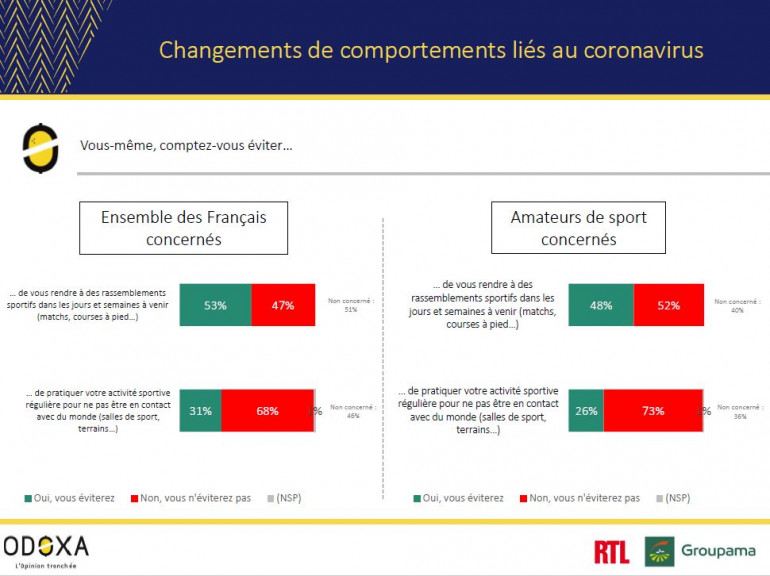Les Français eux-mêmes comptent prendre des précautions : 53% de ceux qui avaient prévus de se rendre à des rassemblements vont l’éviter et 31% des sportifs vont éviter de pratiquer leur activité. Enfin, une courte majorité de Français souhaitent que l’Euro de football (59%) et les JO d'été de Tokyo (51%) soient maintenus.