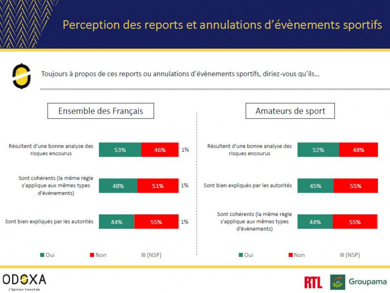 Mais les sondés sont surtout mécontents de deux éléments. D’abord, la pédagogie. 55% des Français et des amateurs de sport jugent en effet que les reports ou annulations sont mal expliquées. En d’autres termes, les raisons des précautions prises ne sont pas toujours comprises par les Français.