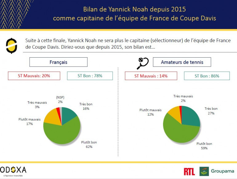 Si les Bleus venaient à conserver leur titre face à la Croatie, ils réaliseraient un exploit que les Français n’ont pas réalisé depuis 1932 et les six victoires consécutives des "Mousquetaires". Quoiqu’il en soit, les Français jugent à 78% que le bilan de Yannick Noah est bon (16% très bon, 62% plutôt bon). Le taux de satisfaits augmente à 86% chez les passionnés.