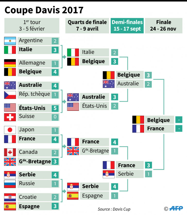 Côté belge, l'homme fort se nomme David Goffin, 12e joueur mondial (Tsonga est 18e), alors que les Bleus n'ont eu sur cette campagne à affronter au mieux que le 44e (le Britannique Dan Evans en quart). Méfiance aussi avec Steve Darcis, qui a aussi atteint son meilleur classement cette année (38e en mai, 77e aujourd'hui), "adore les ambiances de Coupe Davis" et avait réalisé une performance au premier tour en battant le prodige allemand Alexander Zverev.