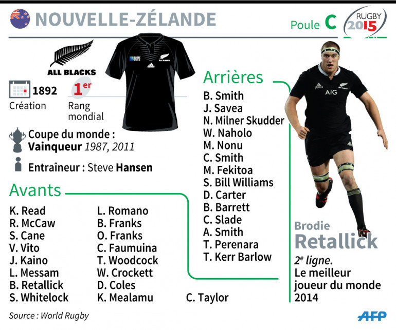 2015 leur portera-t-elle chance alors que cette huitième Coupe du monde posera ses valises en Angleterre du 18 septembre au 31 octobre ? Champions du monde en titre, les All Blacks devront donc tenir leur rang s'ils veulent espérer rester sur la plus haute marche mondiale. Le défi est toutefois accessible pour les coéquipiers de Dan Carter alors que la Nouvelle-Zélande s'appuie sur une conquête solide, un jeu extrêmement huilé et un collectif homogène où stars du ballon ovale et nouvelle génération se côtoient, à l'image de Julian Savea ou Brodie Retallick, 24 ans, élu meilleur joueur du monde en 2014.
