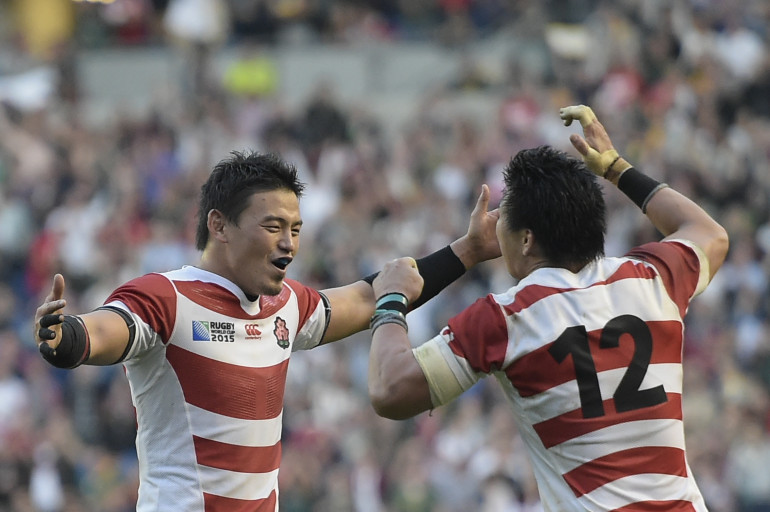 Les Japonais Ayumu Goromaru et Harumichi Tatekawa samedi 19 septembre 2015 lors de la victoire face à l'Afrique du Sud