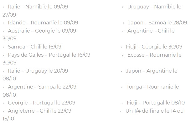 Diffuseur officiel de la compétition, TF1 proposera 14 matchs de poule, dont trois du XV de France, deux quarts de finale, ainsi que les demi-finales, le match pour la troisième place et la finale en 4K sur son antenne. Les rencontres seront accessibles sur la chaîne TF1 4K chez Bouygues Telecom (canal 37), Orange (canal 990), Free (canal 101) et SFR (canal 77). L'application Molotov propose aussi la chaîne dans son offre payante. En revanche, la chaîne TF1 4K n'est pas disponible sur les décodeurs Canal+ ni sur MyCanal.
