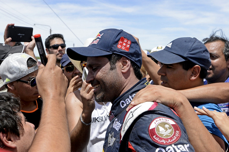 Nasser Al-Attiyah félicité après sa victoire sur la 2ème étape, entre Villa Carlos Paz et San Juan, le 5 janvier 2015.
