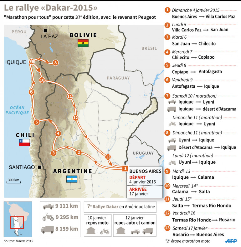 Les 414 véhicules engagés prendront le départ aujourd'hui de Buenos Aires pour une boucle de 9.200 km, dont 4.700 km de spéciales chronométrées, qui les ramènera le 17 janvier dans la capitale argentine, après une escapade en Chili et en Bolivie.