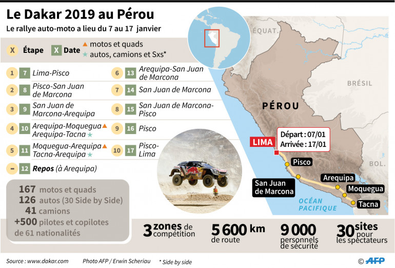 Du Paris - Dakar au Lima - Lima. 40 ans après le premier départ de celui qui est devenu le plus célèbre et le plus envié des rallyes-raids, le Dakar 2019 s'est élancé de la capitale du Pérou, lundi 7 janvier. Et pour la première fois de son histoire, la course se déroule dans un seul pays.