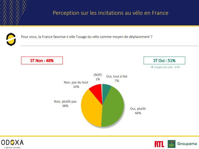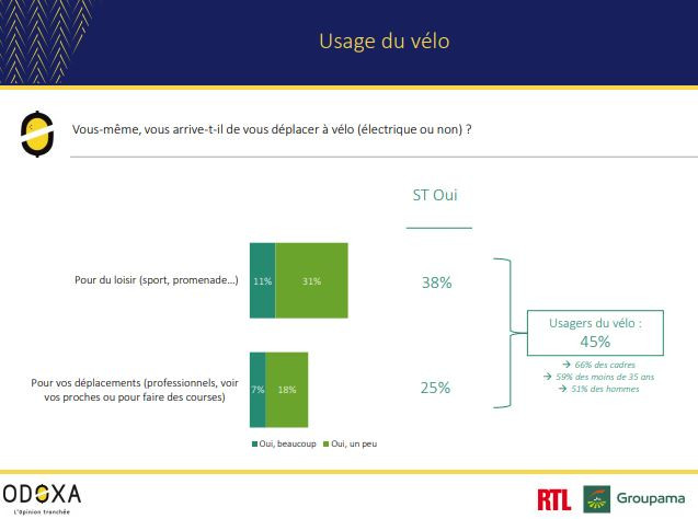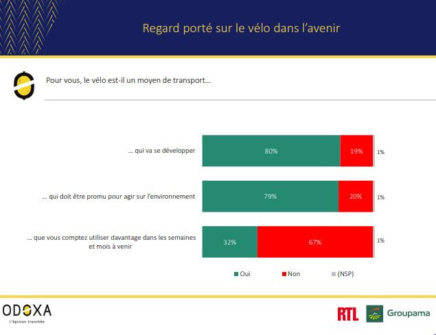 Près d’un Français sur deux (45%) se déclare aujourd’hui comme un usager du vélo, 38% s'en servant pour faire du sport ou se promener et 25% pour les déplacements. Ils sont 47% à utiliser davantage la bicyclette depuis le déconfinement et 80% à penser qu'elle va se développer à l'avenir. Enfin, 51% des sondés estiment que la France favorise l'usage du vélo comme moyen de déplacement.
