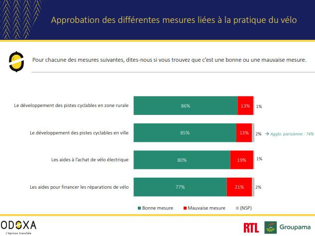 De même, 80% de nos concitoyens approuvent les aides à l’achat de vélo électrique et 77% jugent qu’aider les Français à faire réparer leur vélo est une bonne mesure.