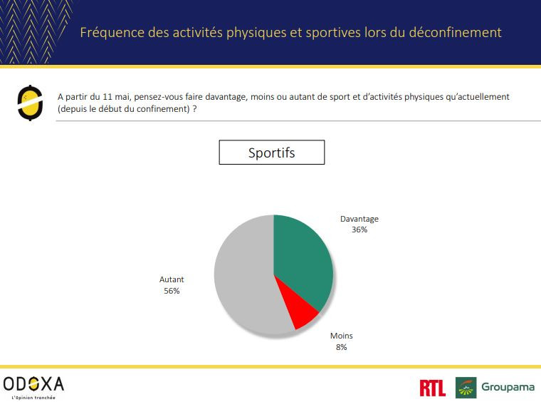 Si les sportifs ont maintenu un certain niveau d’activité durant le confinement, poussant la majorité d’entre eux à déclarer un niveau équivalent à venir à partir du 11 mai, plus d’un tiers d’entre eux (36%) compte bien augmenter sa pratique. Ils ne sont d’ailleurs que 8% à