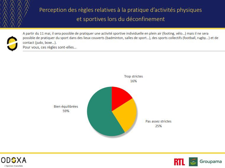 Près de 6 Français sur 10 jugent "bien équilibrées" les règles concernant la pratique du sport à partir du lundi 1 mai, premier jour du déconfinement en France. 64% de ceux qui pratiquent une ou plusieurs activités sportives en France se déclarent en manque, un chiffre qui monte à 71% chez les 18-24 ans.