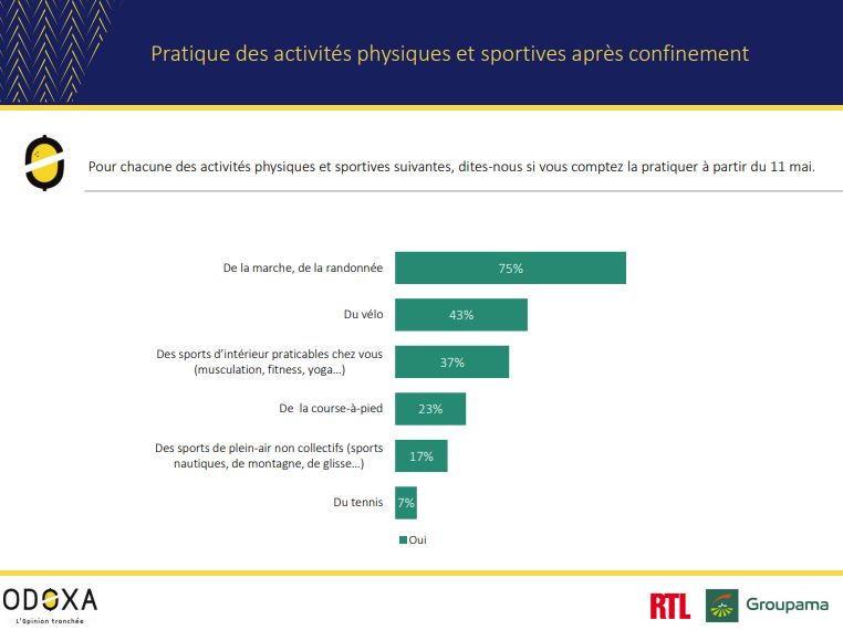Les beaux jours aidants et les activités de plein air autorisées, la marche, la randonnée et le vélo arrivent en tête des sports que les sondés souhaitent pratiquer. Voici les principaux enseignements de la dernière enquête réalisée par Odoxa pour RTL et Groupama.