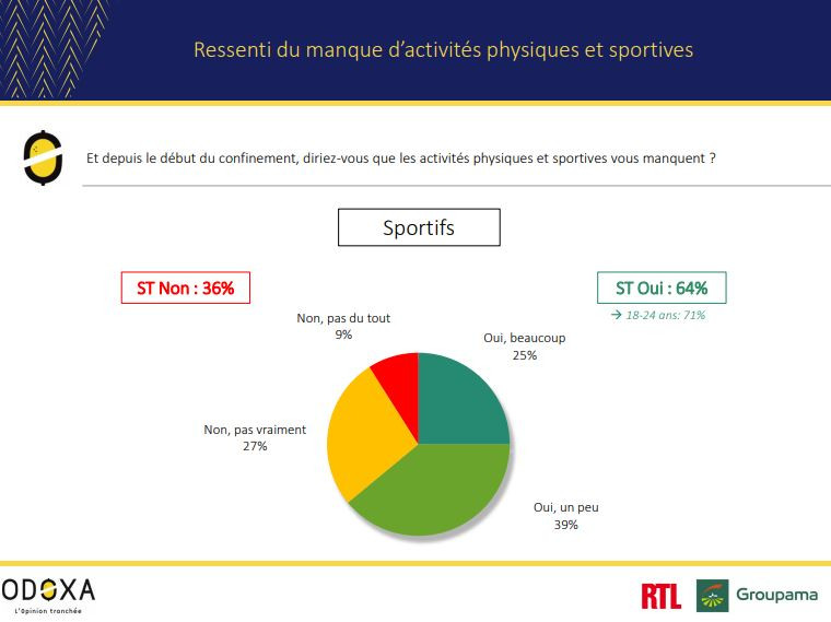 64% des sportifs nous confient ainsi que les activités physiques ou sportives leur manquent depuis le début du confinement. Ils sont même 71% chez les 18-24 ans.