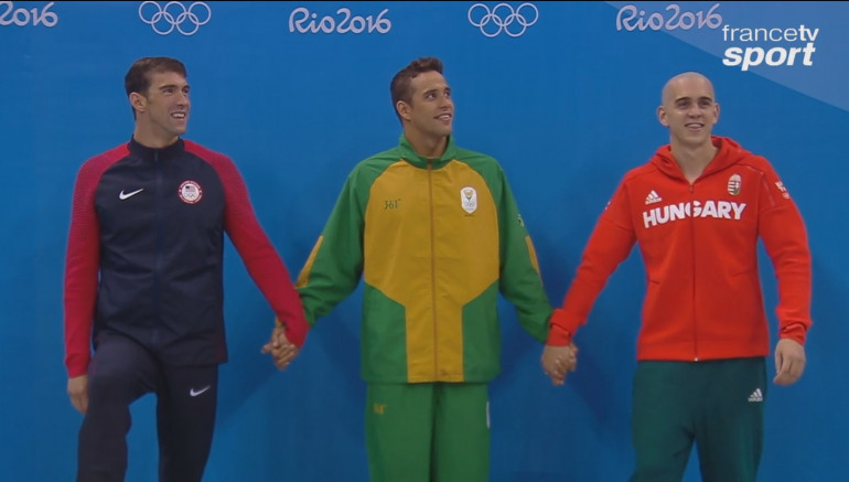 Michael Phelps, Chad Le Clos et László Cseh ex-aequo à la 2e place du 100m papillon.