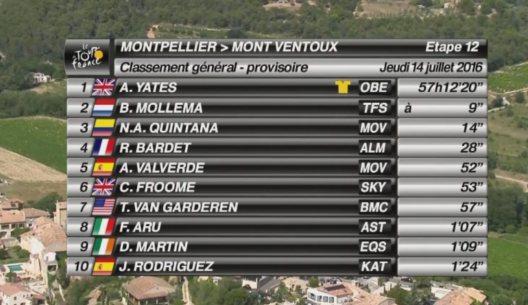17h06 - Adam Yates devrait récupérer le maillot jaune devant Mollema et Quintana selon le classement général provisoire.