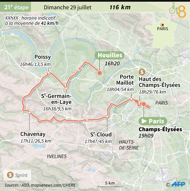 Les coureurs du Tour de France, Geraint Thomas en tête, sont partis dimanche peu avant 16h30, pour la 21e et dernière étape, reliant Houilles (Yvelines) à la capitale. Les 145 rescapés, sur 176 coureurs au départ, ont parcouru près de 116 kilomètres. Le peloton, venu par avion de Pau (Pyrénées-Atlantiques) dimanche matin jusqu'à l'aéroport francilien du Bourget, a rallié ensuite Houilles pour le départ.