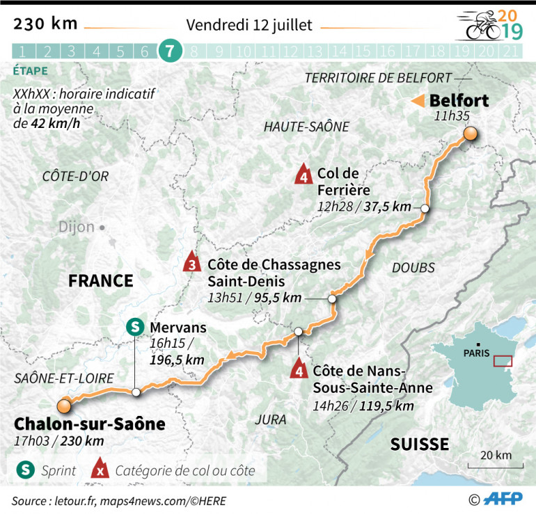 Samedi, la 8e étape emprunte un parcours de moyenne montagne au long des 200 kilomètres reliant Mâcon à Saint-Etienne, avec pas moins de sept côtes au programme.