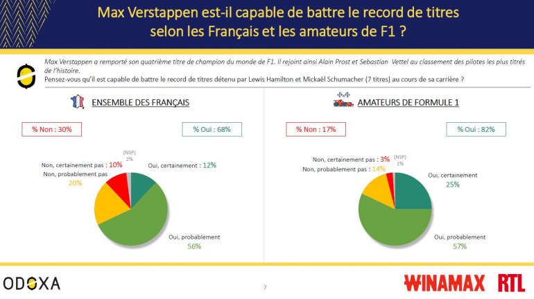 Déjà à hauteur de Alain Prost et Sebastian Vettel avec quatre titres mondiaux (2021, 2022, 2023, 2024), Max Verstappen est en mesure de battre le record de sept couronnes co-détenu par Michael Schumacher et Lewis Hamilton, estiment 68% des Français et 82% des amateurs de Formule 1.